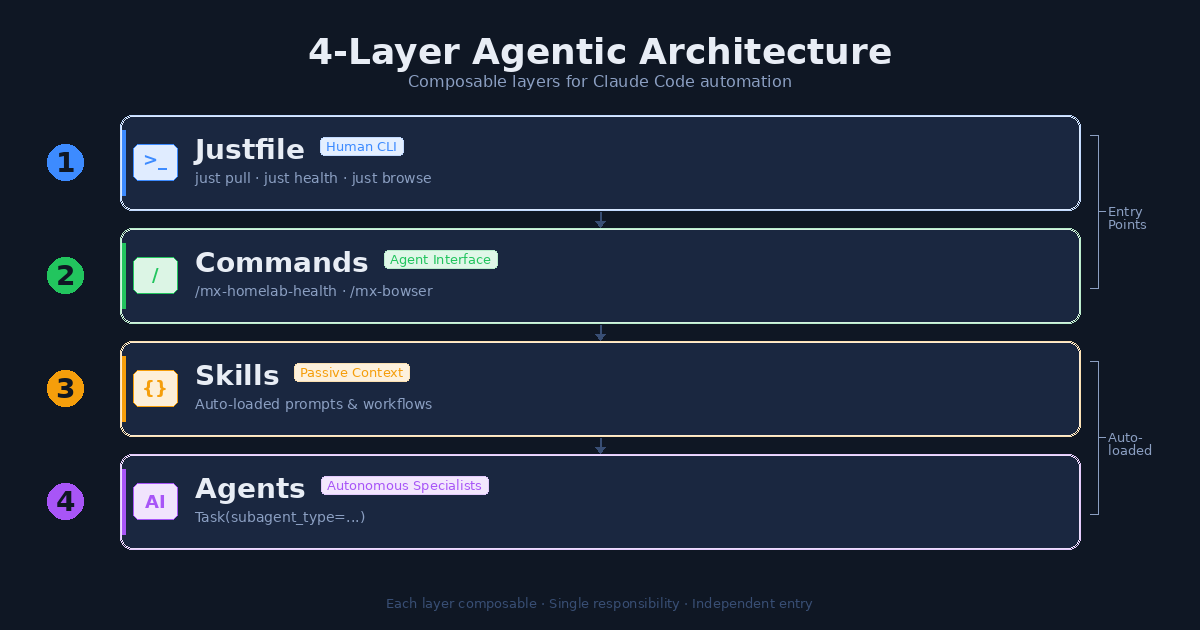 IndyDevDan’s Bowser framework introduced a clean mental model: composable layers where each has a single responsibility and can be entered independently. His stack was designed for browser automation, but the pattern is universal.